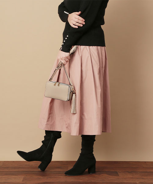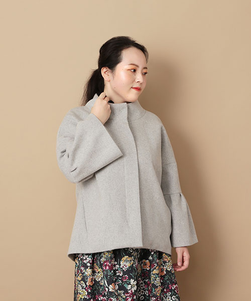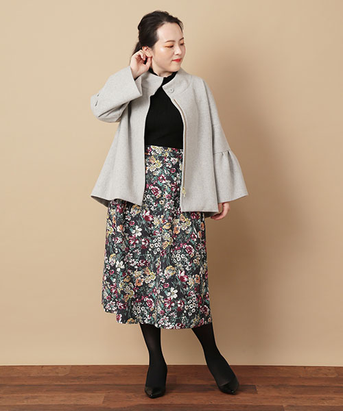やわらかなビーバー素材をベースに軽さにこだわった上質なコートは丸みを帯びたフォルムがフェミニンなデザイン。色とりどりの華やかなフラワープリントをのせたローズティアラオリジナルプリントのスカートと合わせて大人可愛いスタイルに。
