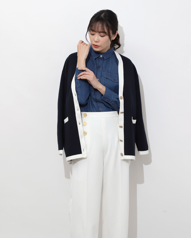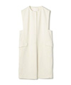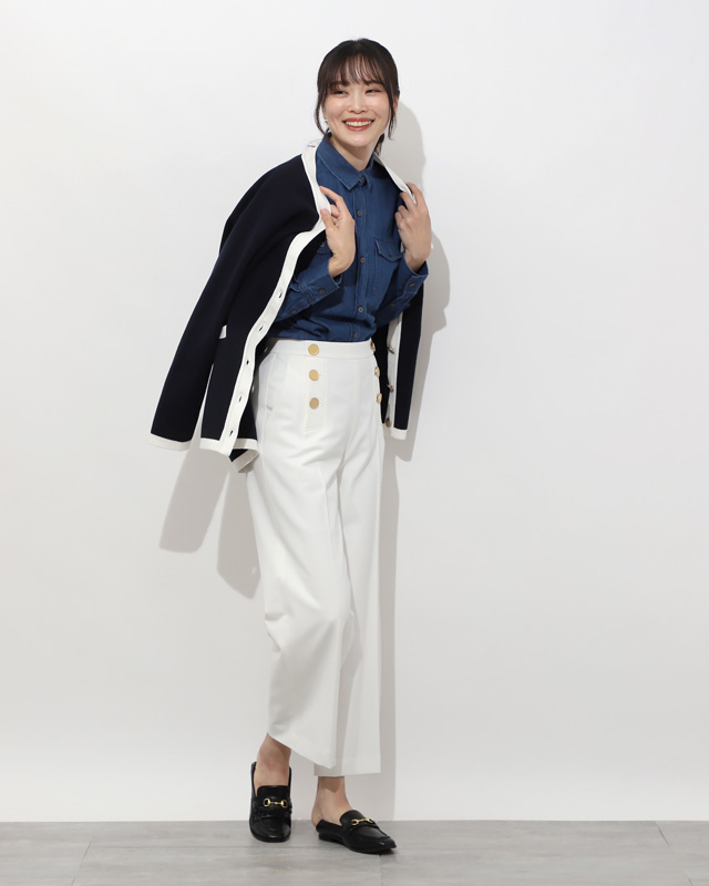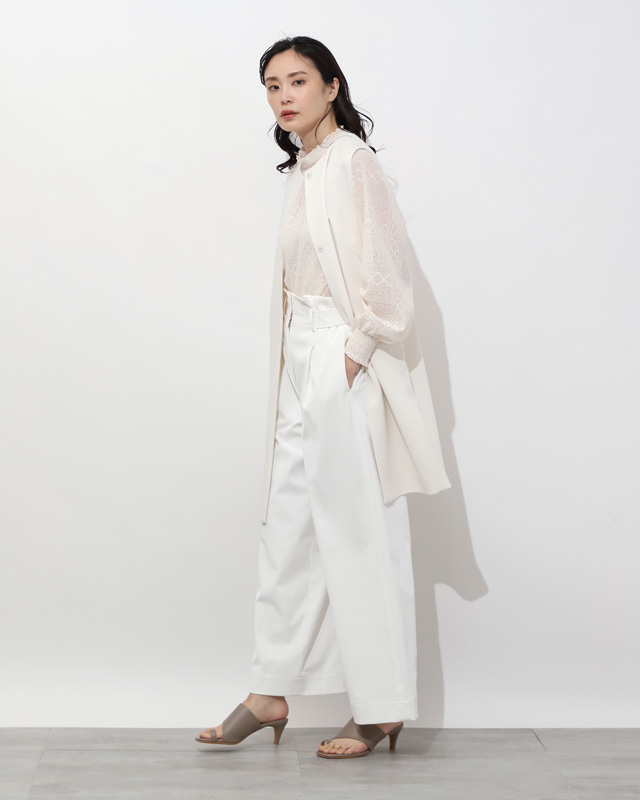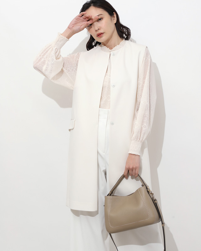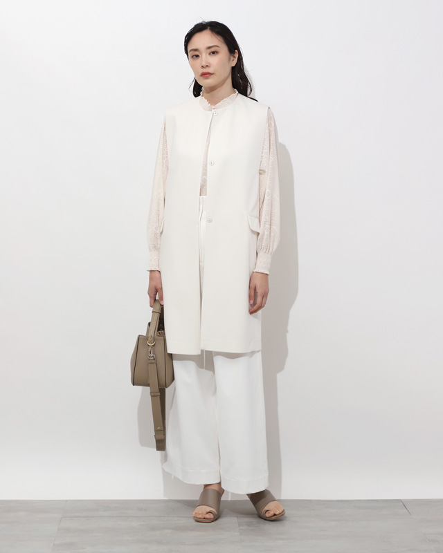 オールホワイトで清潔感たっぷりにミニマルですっきりとしたデザインのジレは、甘めブラウスとも好相性。色のトーンを合わせたレイヤードも、立体感が出て今っぽく。