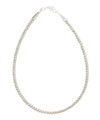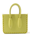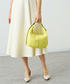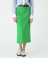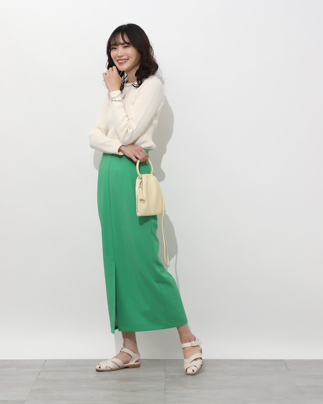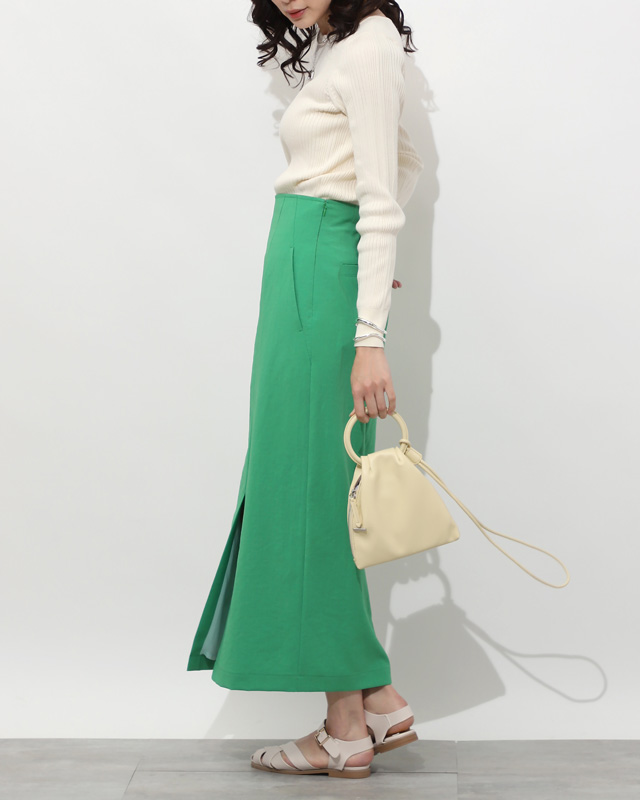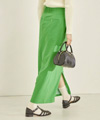 グリーンをポイントに存在感あるグリーンのスカートは、潔くシンプルなニットを合わせるだけでOK。シルバーを重ねて着こなしをシャープに引き締めて。