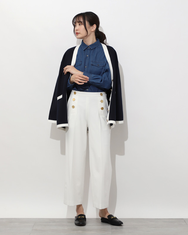 新鮮な着こなしにアップデートデニムシャツをメインにヘルシーなマリンスタイルを提案。シャツはボタンを全部留めてあえて抜け感を作らないのが今っぽく仕上げるポイント。