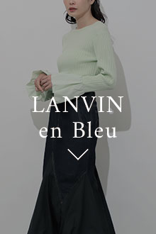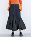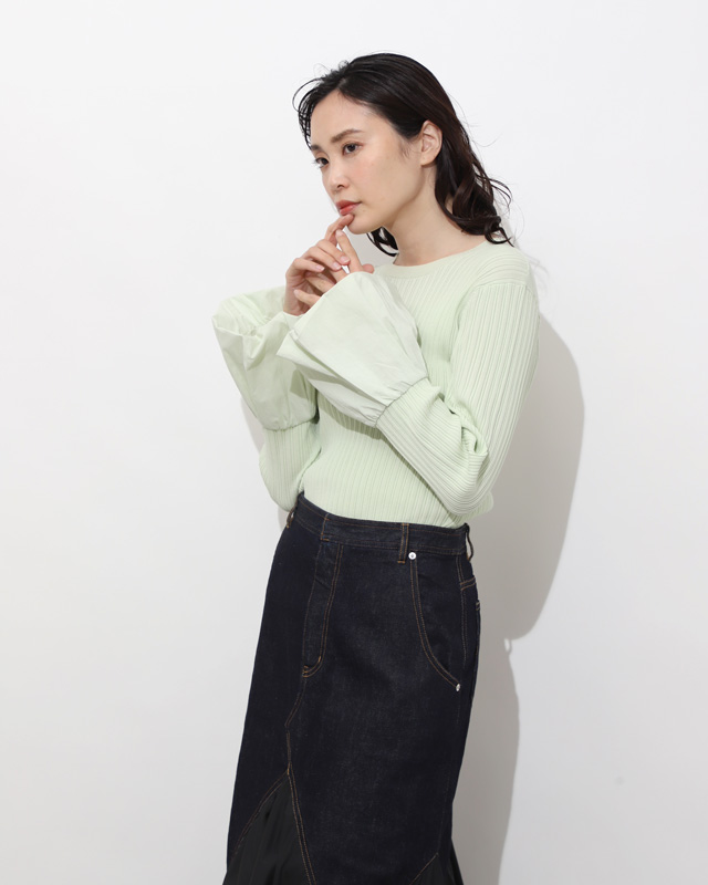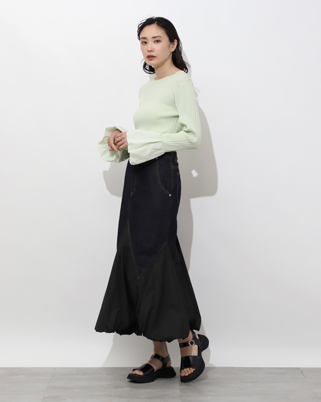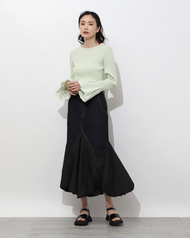 個性を発揮デニム素材と相反するタフタ素材のコントラストがユニークなコンビネーションスカート。軽やかなきれい色のリブニットが着こなしを引き立てて。
