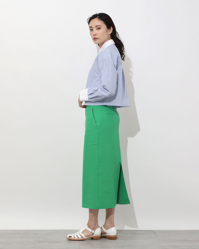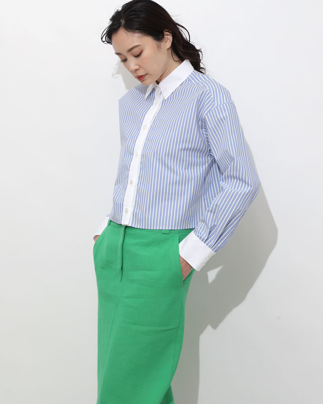 クロップド丈×グリーン流行アイテムも、きちんと感のあるシャツなら取り入れやすさも抜群。モードなシャツに甘さ控えめのグリーンの組み合わせでキレよくかっこよく。