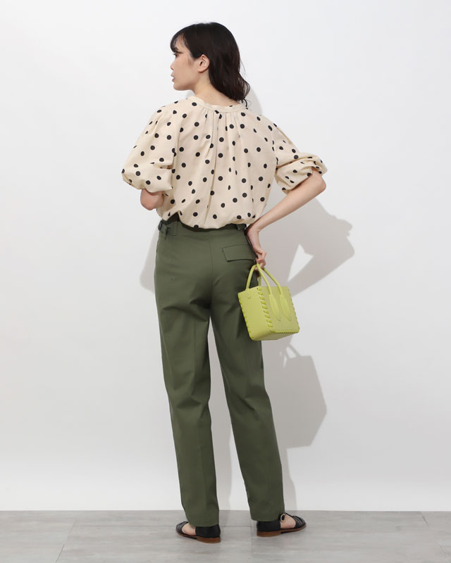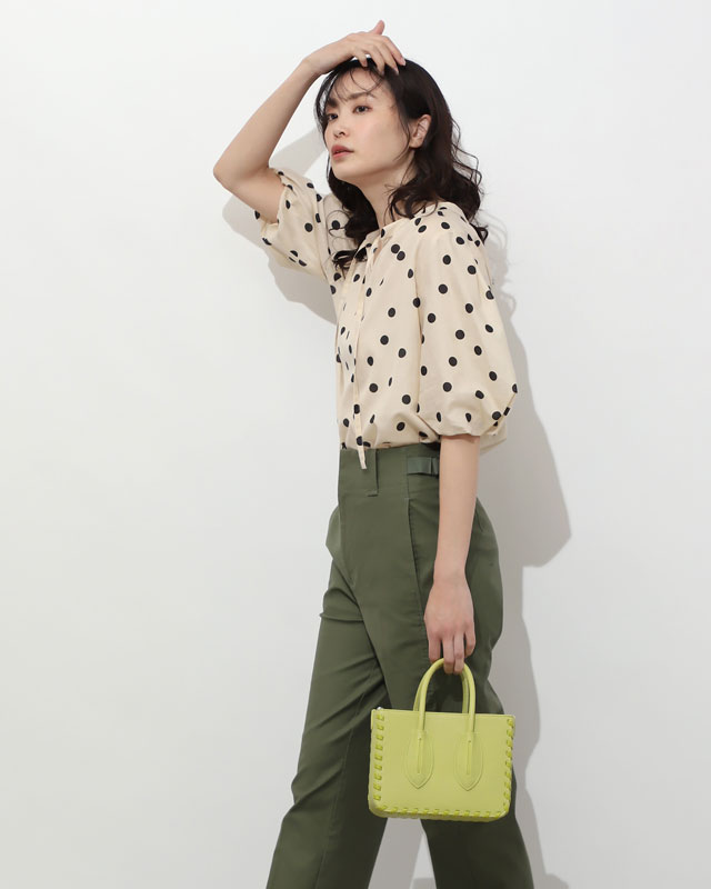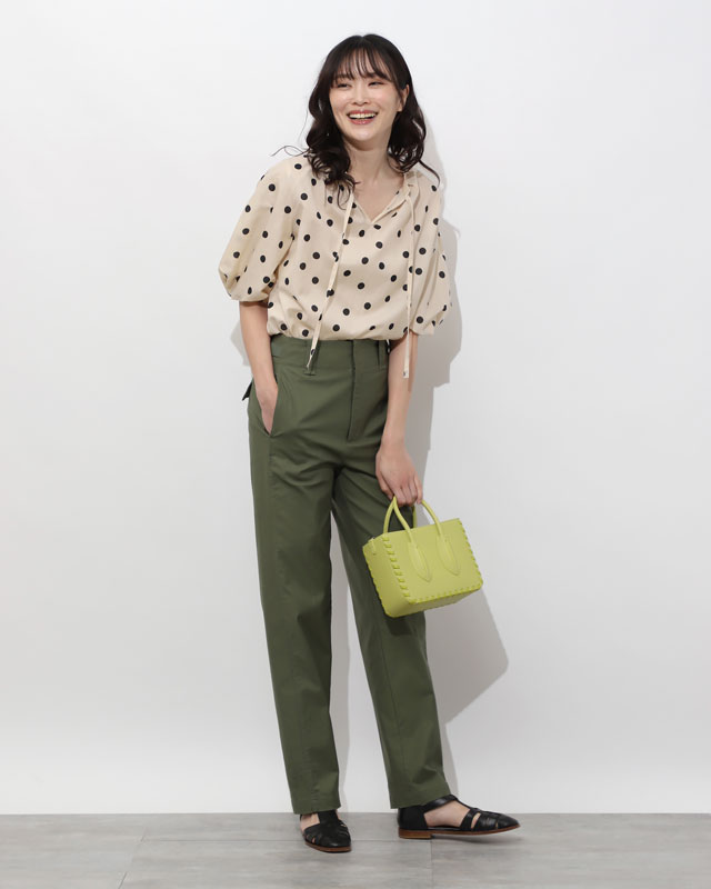 着こなすのが今の気分大きめのドット柄やパフスリーブのふわっと感が大人かわいいブラウスに、タフなカーゴパンツで真逆のテイストをミックス。ライムグリーンのバッグを差し色に効かせて。