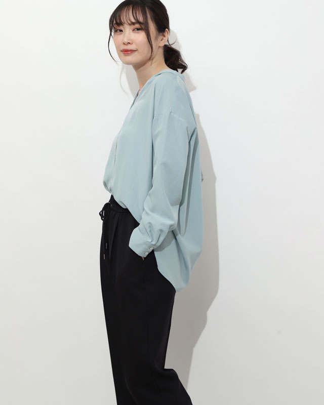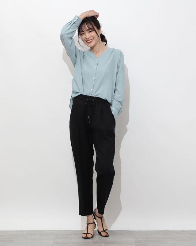 春ブラウスを新鮮な着こなしに爽やかなサックスブルーのブラウスに、春は細身のドロストパンツを合わせるのが新鮮。パンツ自体がスポーティなので、足元はきれいめを意識するのがおすすめ。