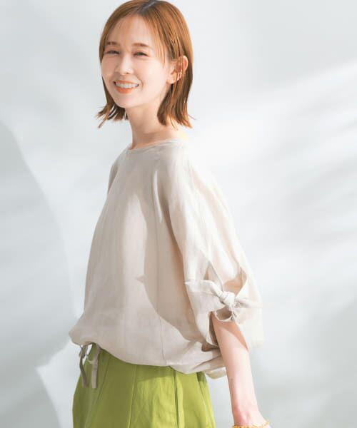 リネン100%の涼し気なブラウス。ゆったりとしているので体型を拾わず、通気性も良いので夏にぴったり。袖のリボンは甘すぎず、程よいアクセントに。色違い買いも続出していてこの夏も大活躍間違いなし♪