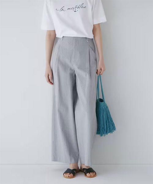 コットン100%。ハリのある素材は肌にあまり触れず涼しい着心地で夏に活躍してくれます。ストライプとハイウエストが脚長効果が期待できます。毎年人気のパンツです。