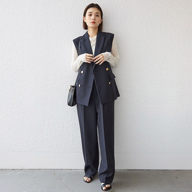 トップスはTシャツやノースリーブなど夏アイテムのまま、一気にシックで洒落るマニッシュパンツ。メリハリを意識した、しっかりと量感のあるシルエットを選ぶのがポイント。
