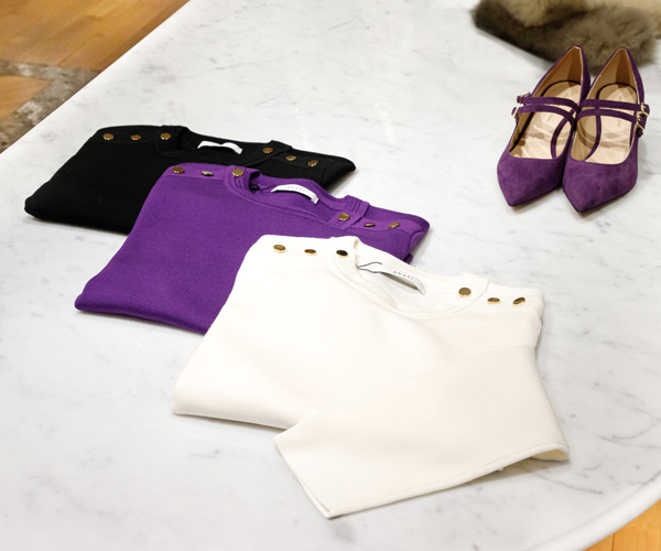 肩のメタルボタンがポイントのニットは、同シリーズのスカートとセットアップでの着用もお勧め。