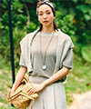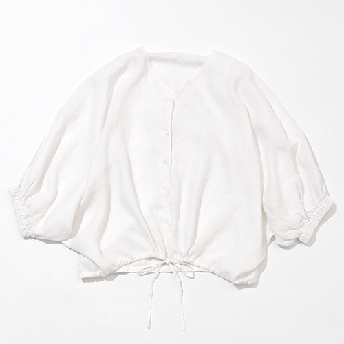 さらりと心地いいリネンブラウス。ドロスト紐でシルエット変化や、フロントボタンの開きを調整したりと、さまざまにアレンジ可能。