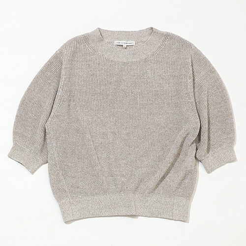 合わせるボトムを選ばない、イージーケアの万能サマーニット。パフスリーブと表情のある編み地がカジュアルすぎず、こなれた印象に。