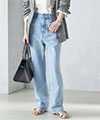 今季注目の淡色デニムに、大胆なレッドのティアードブラウスを。
