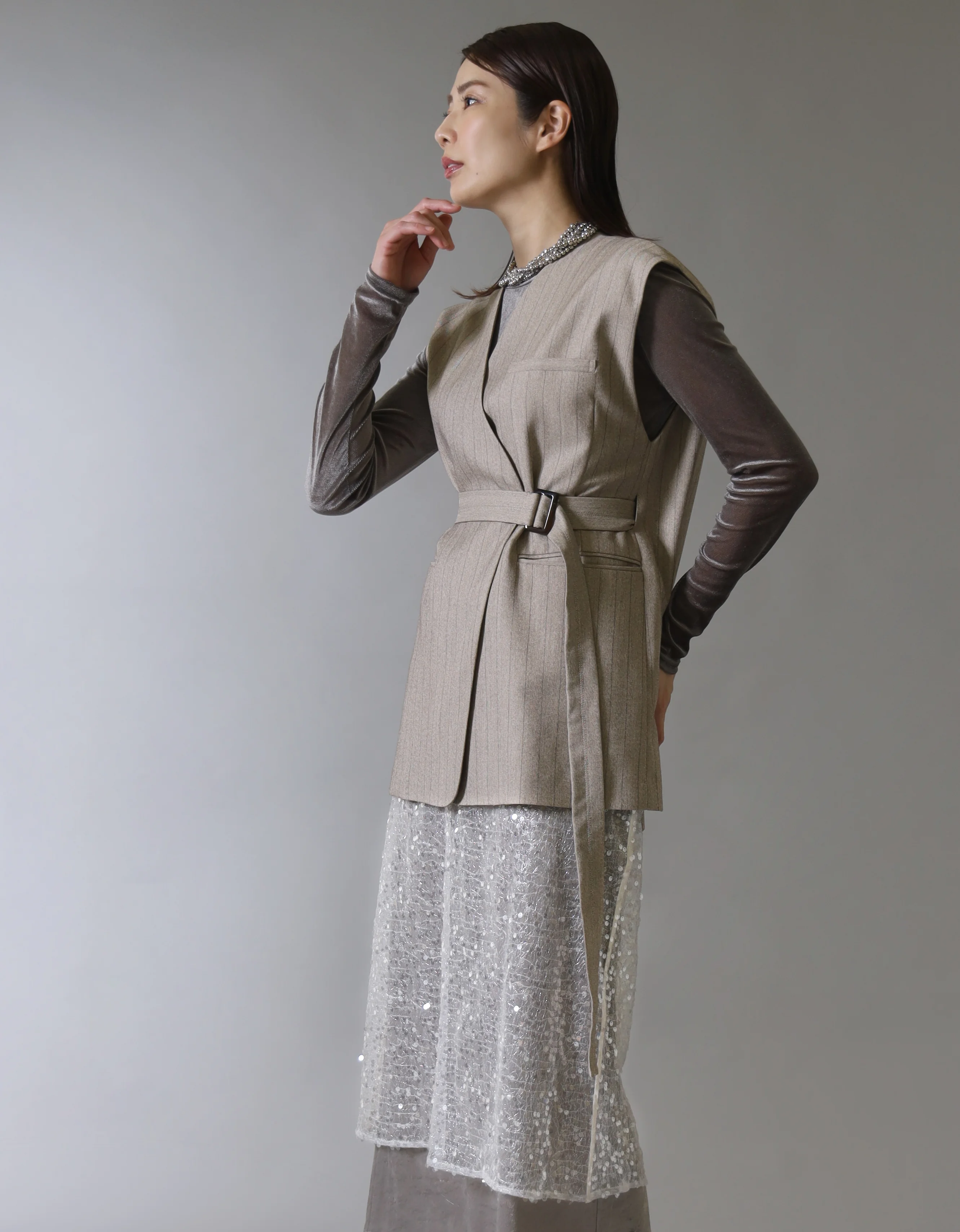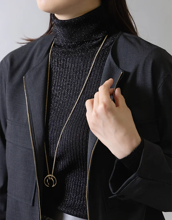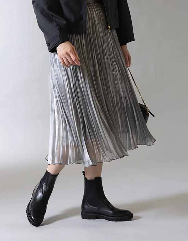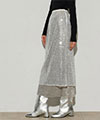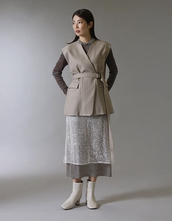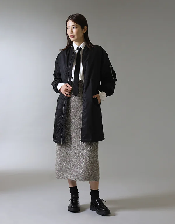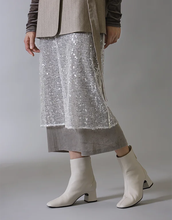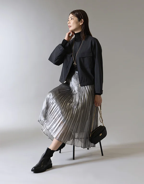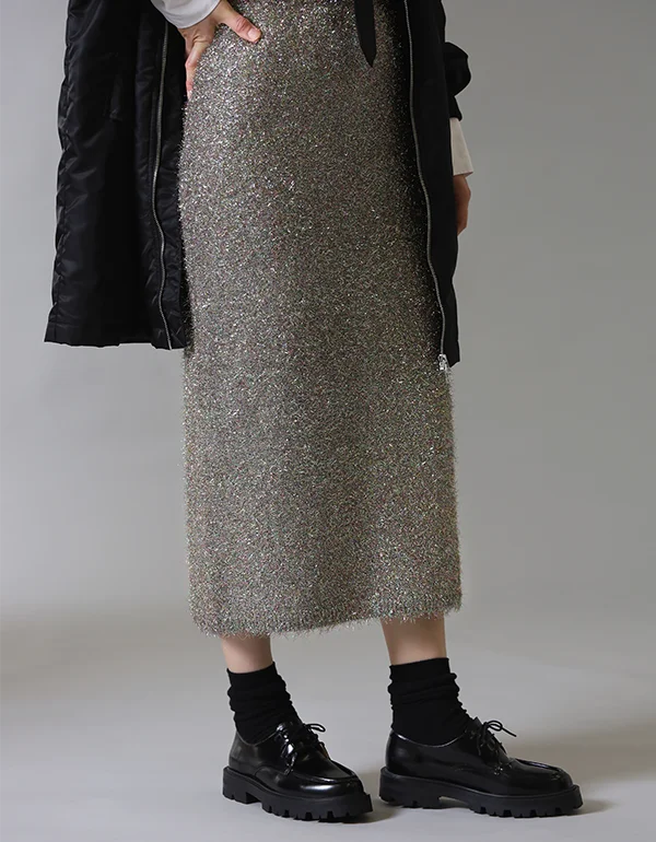 トレンドのキラキラを大人に昇華した、ニット&スカート。