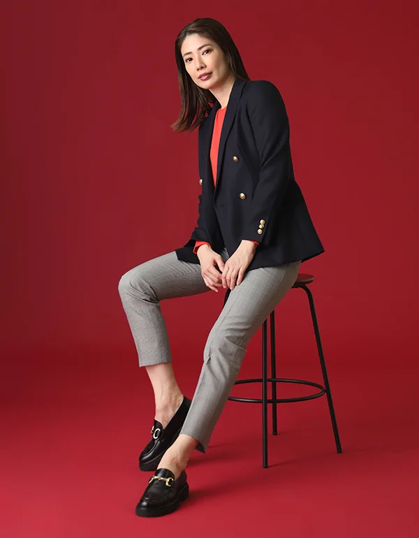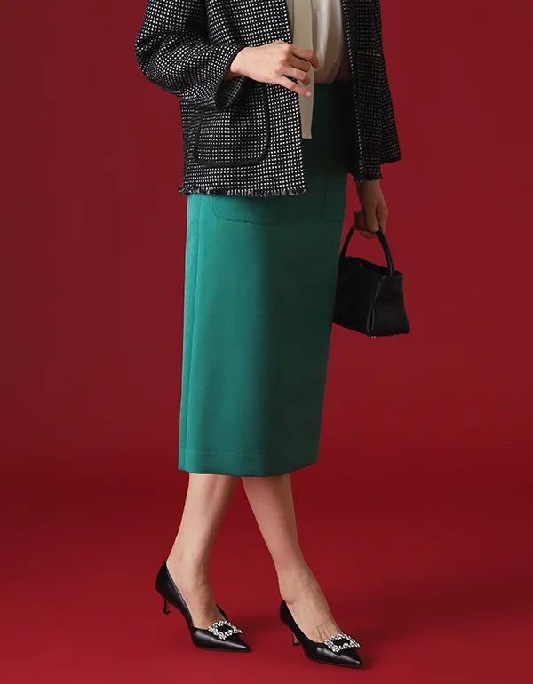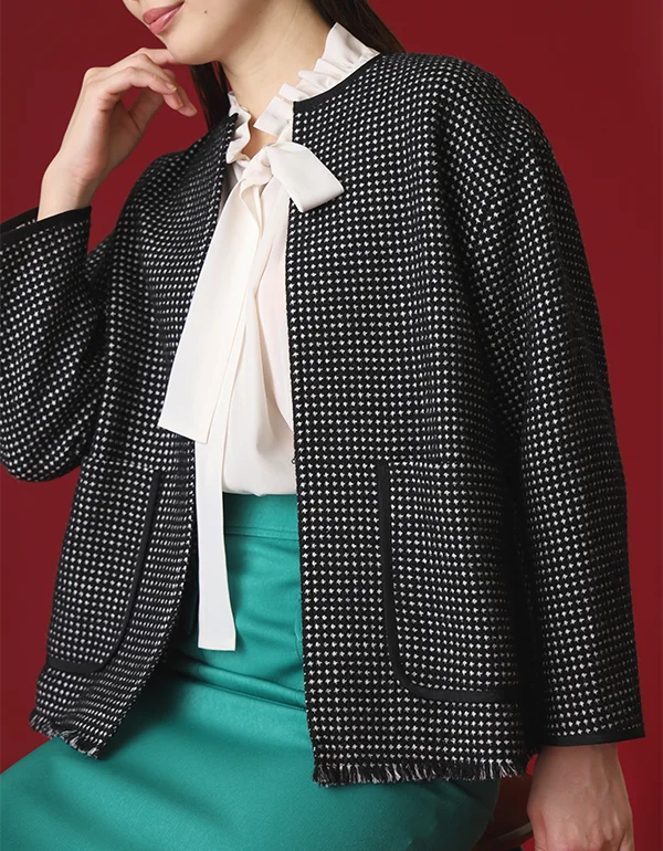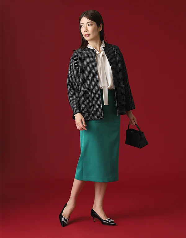 ツィードジャケットに甘めブラウスを忍ばせて華やなアクセントを。鮮やかなグリーンで感度の高さをアピール。