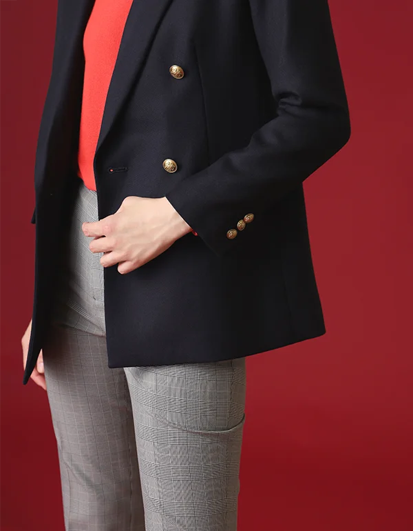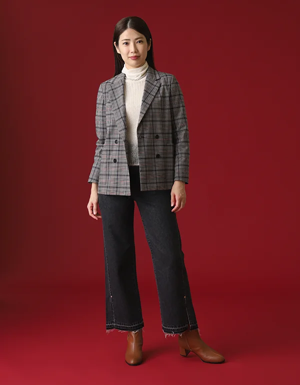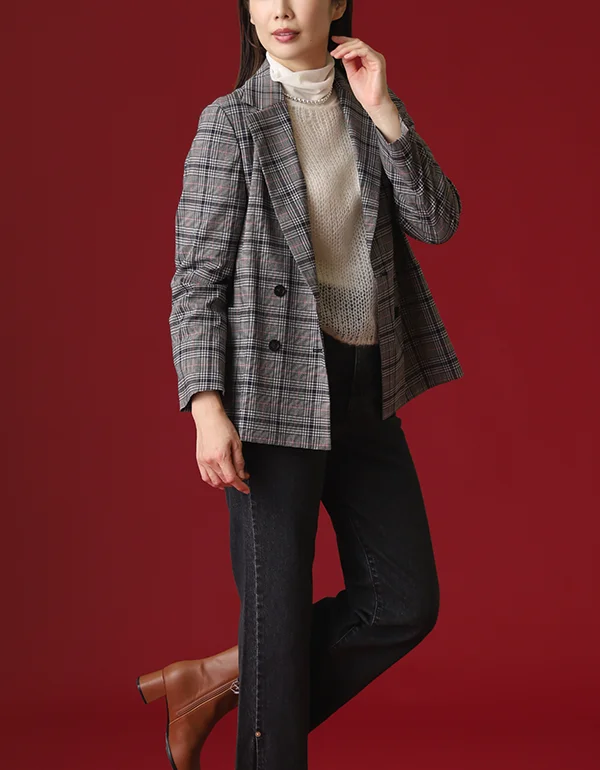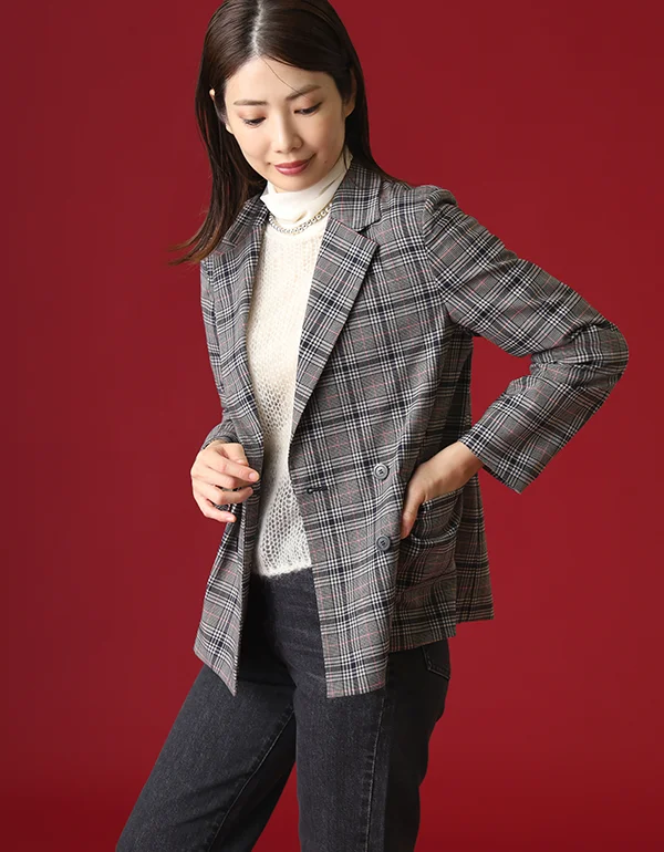 ベーシックながら特徴的なグレンチェックが印象的なダブルジャケット。