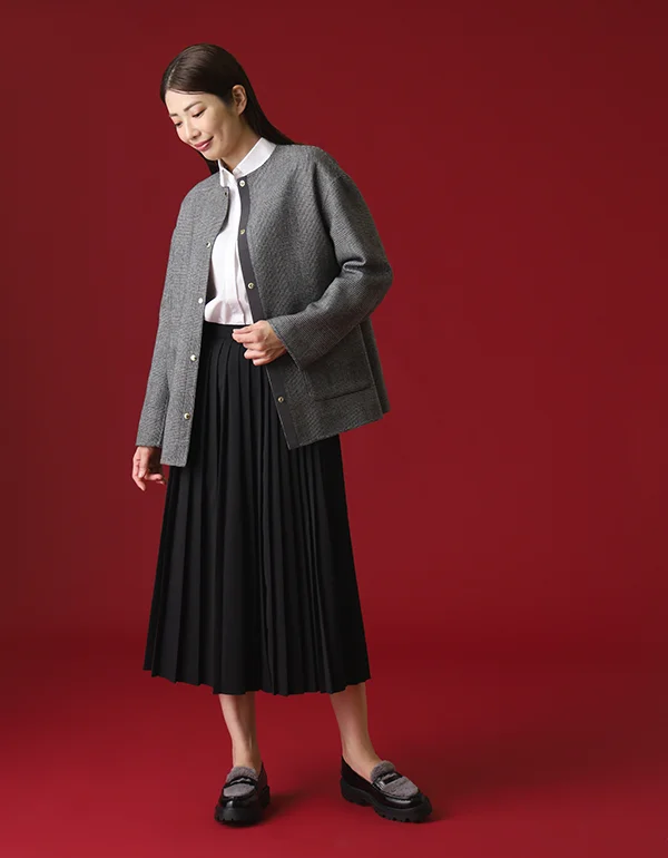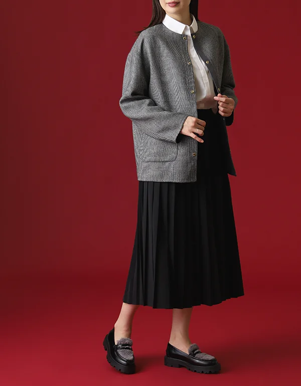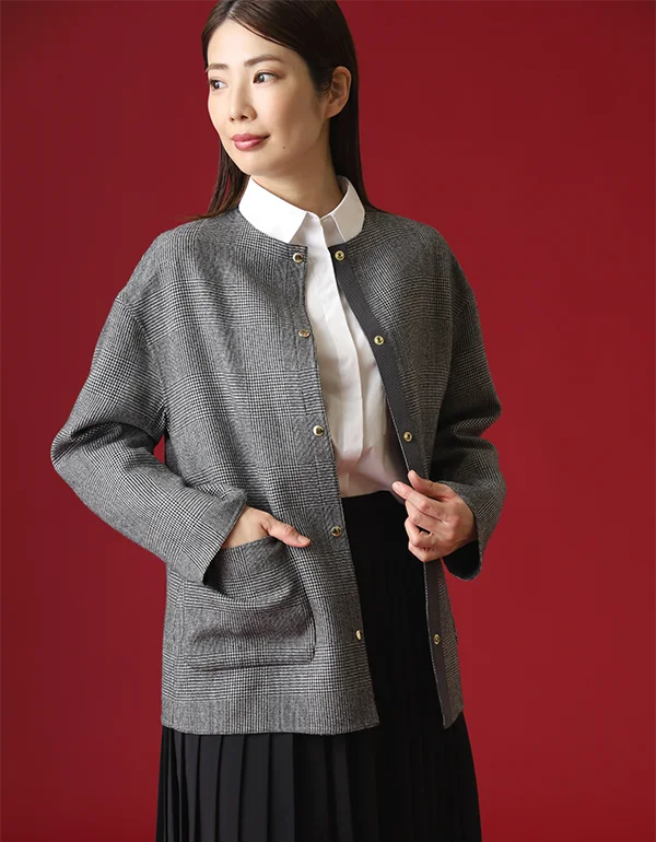 グレンチェック柄×チャコールグレーのリバーシブルコート。カーディガンのような軽い着心地は長い期間使える名品。
