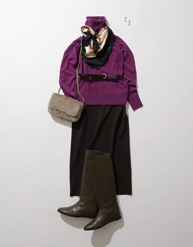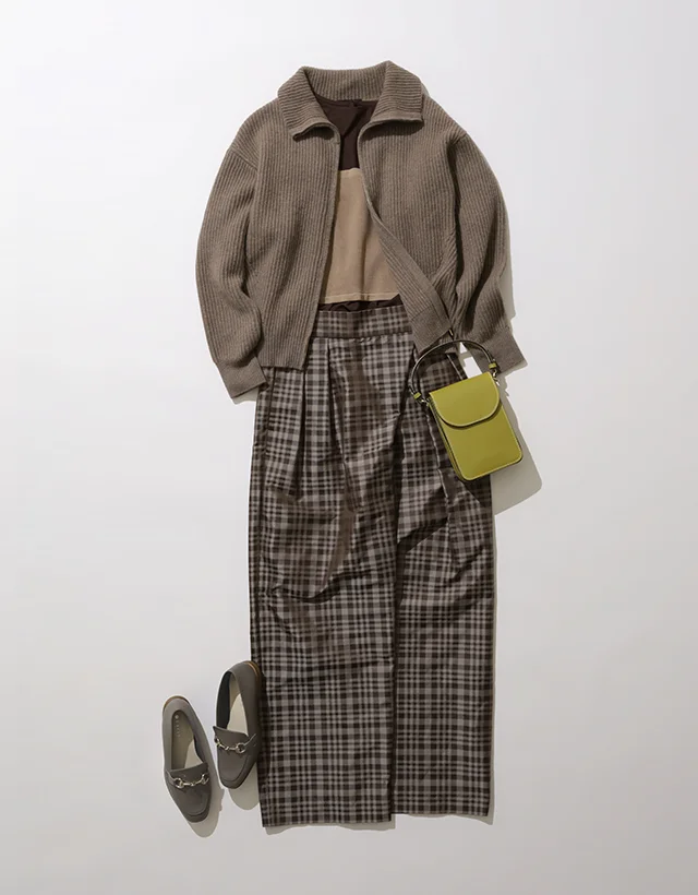 ワントーンコーデをスタイリッシュに着こなせるのは、オータムタイプならでは。シックなブラウンカラーが肌色のトーンを整え滑らかに見せてくれます。