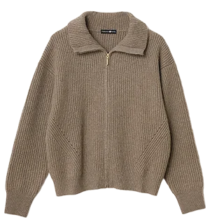 ゴールドのジップを効かせたニットジャケット。ふっくら質感の編み地が存在感を演出しながら、包み込むような心地よい素材感が魅力。