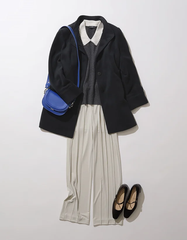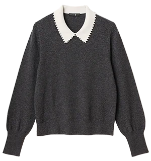 チャコールグレー×ホワイトのパール襟が特徴的なニットは、メリハリのある配色でウィンタータイプにぴったり。