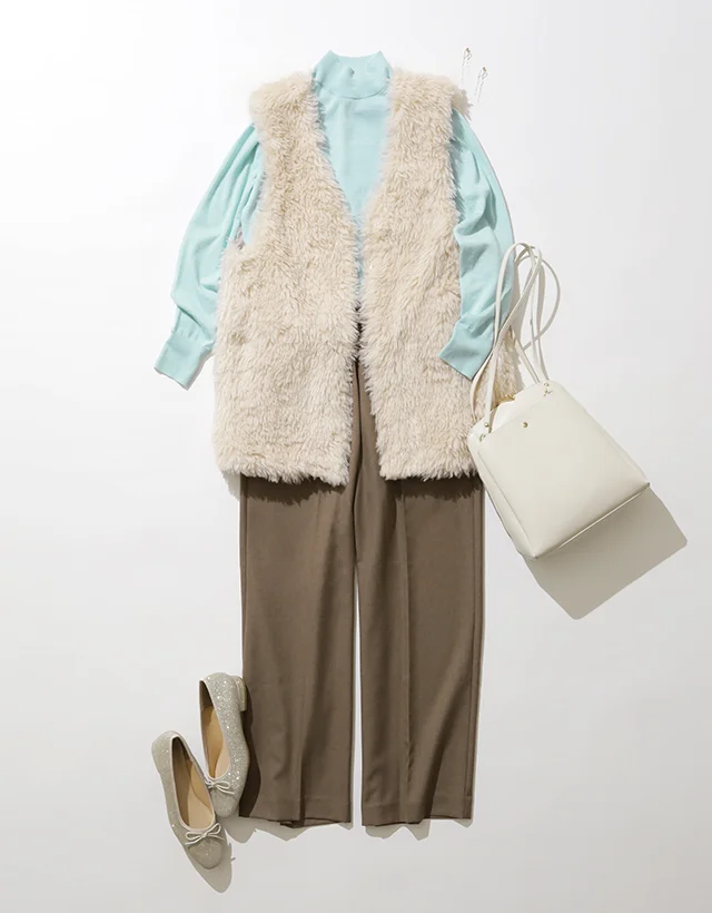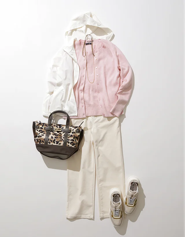 淡いシュガーピンクのニットは肌に血色感をもたらし、健康的でキュートな印象に。パンツとブルゾンには、スプリングタイプが得意なベーシックカラーであるオフホワイトをチョイス。