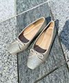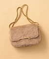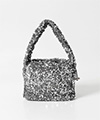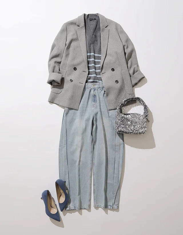 カジュアルなデニムパンツとメンズライクなジャケットには、グリッターバッグとパンプスでレディライクに仕上げて。