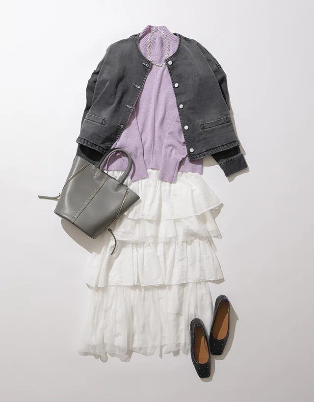 デニムジャケットには印象的なチュールスカート合わせで甘辛MIXに。アクセはブルべの得意なシルバーで爽やかさをプラス。