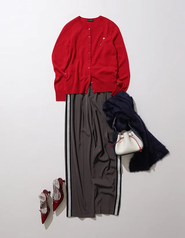 パンツやストールはシックなブルべカラーでまとめることで、赤を利かせたコーデに。