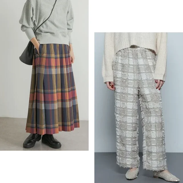 プレッピースタイルの定番パターンのチェック。今季はバリエーション豊かなチェック柄がお目見え。存在感ある柄はボトムスだと取り入れやすい♪