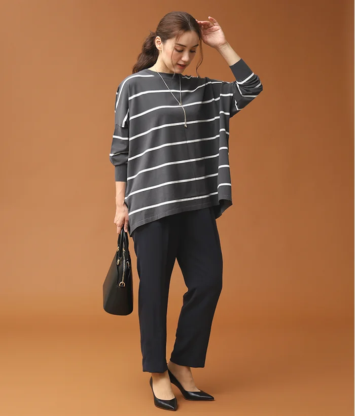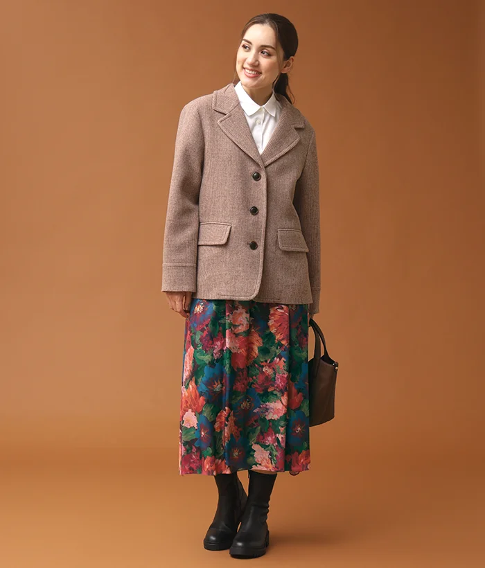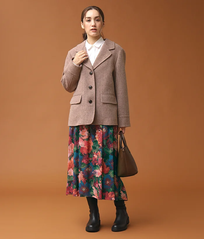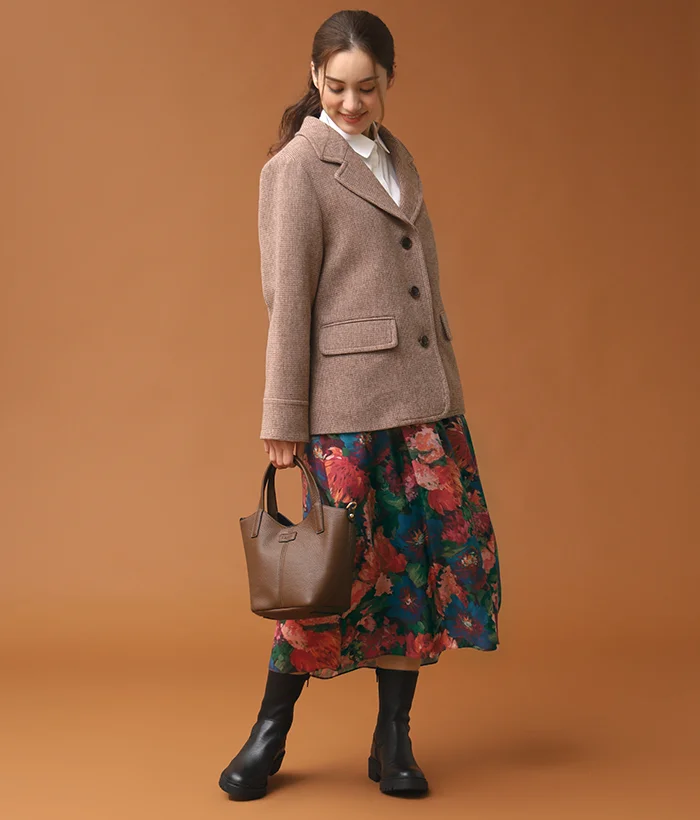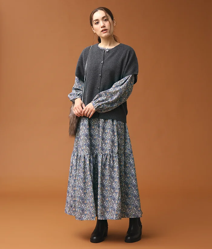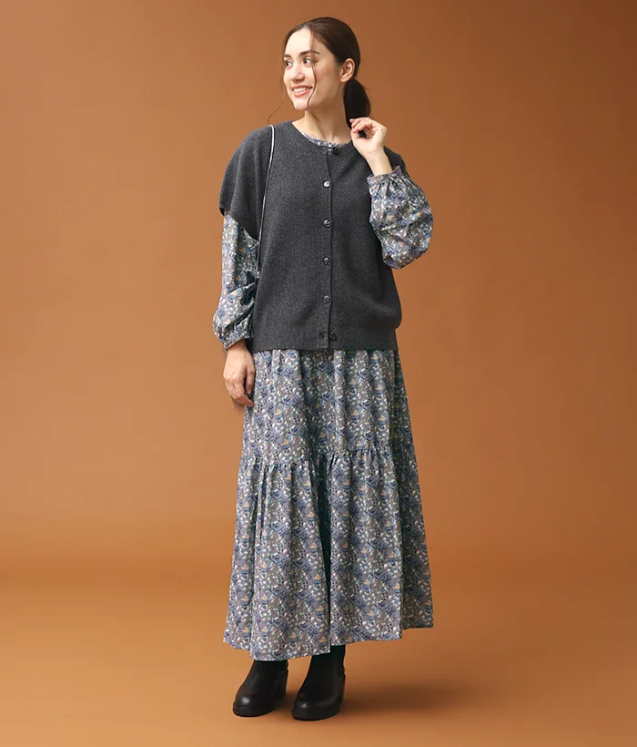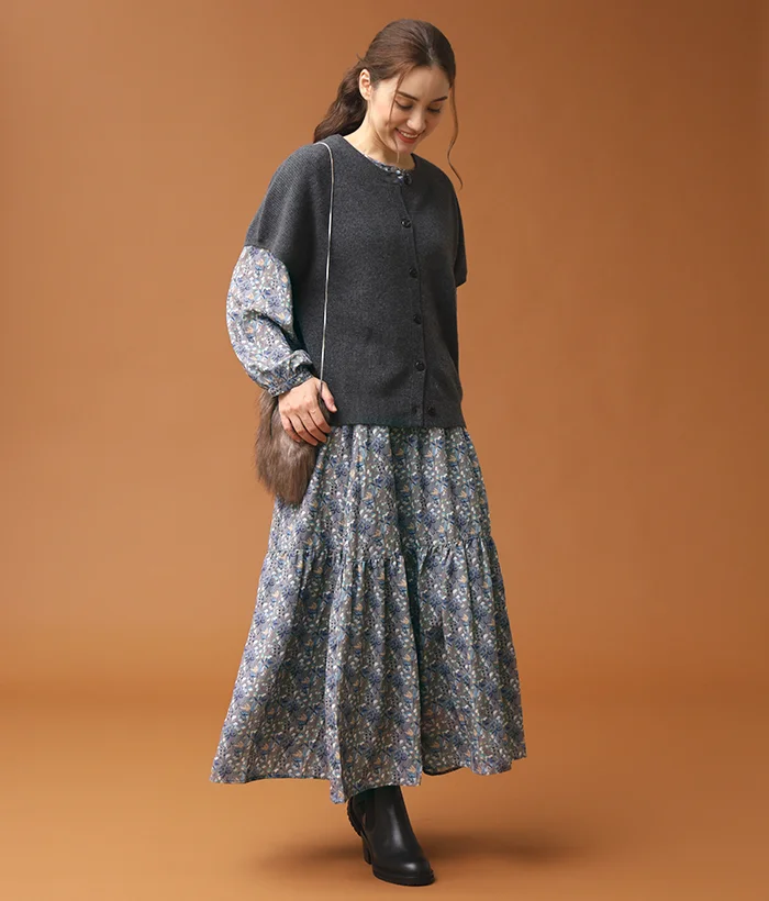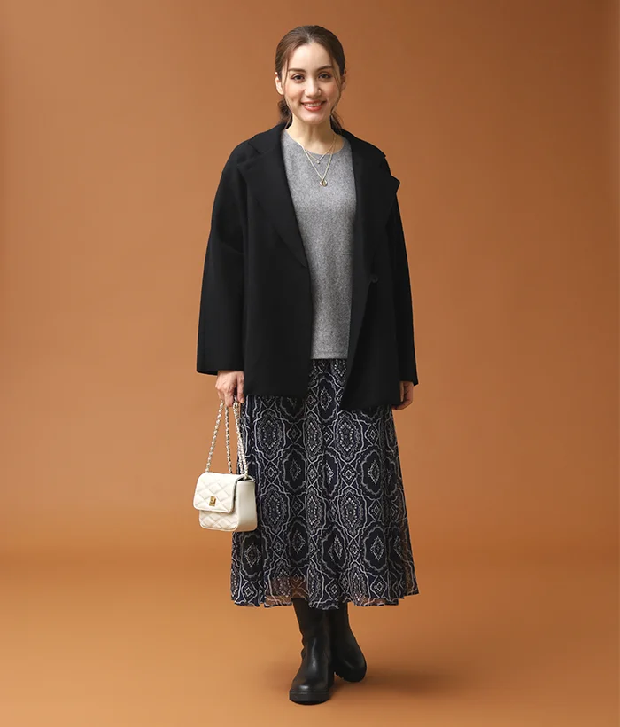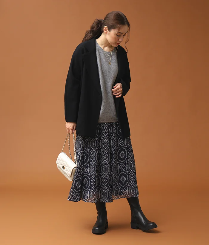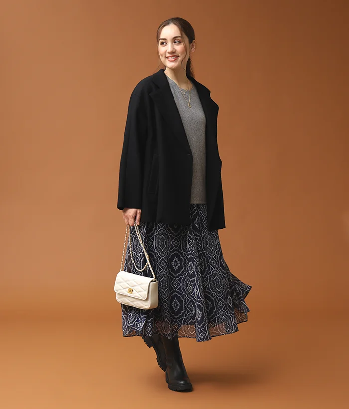 ゆったりとした着心地のよいニットに、ながれるようなシルエットのプリントスカートをレイヤードすることで、カジュアルすぎないきれいめな雰囲気に。煌めくネックレスや淡い色合いのバッグで、スタイリングに優しいアクセントを加えて。