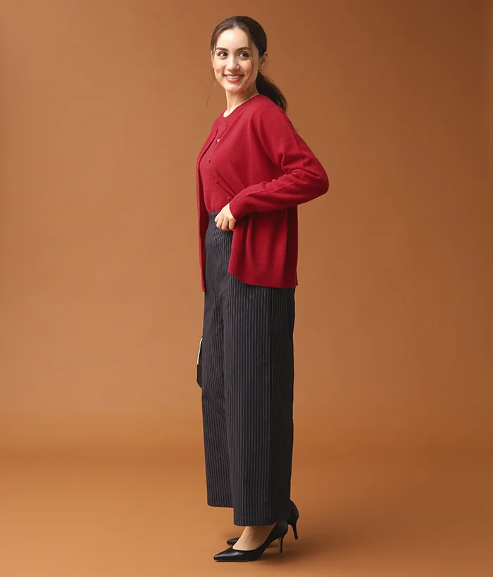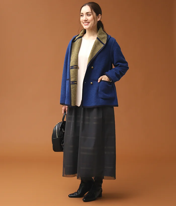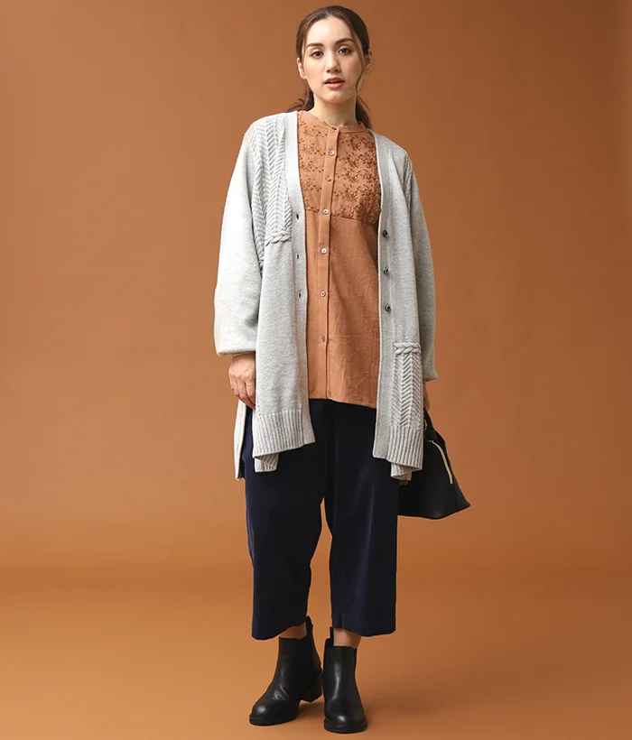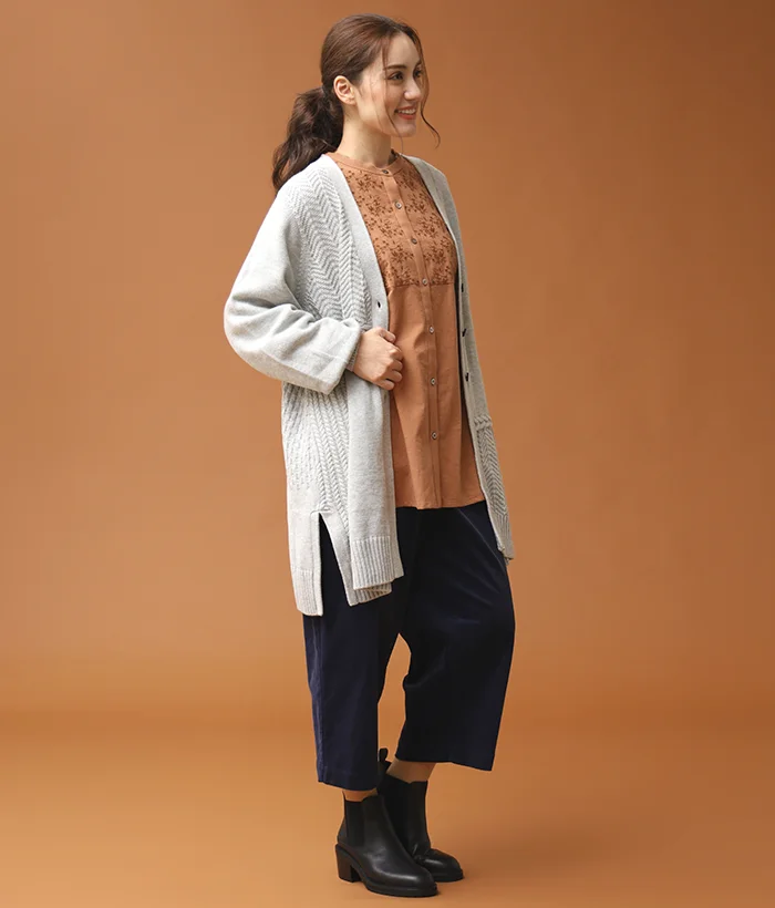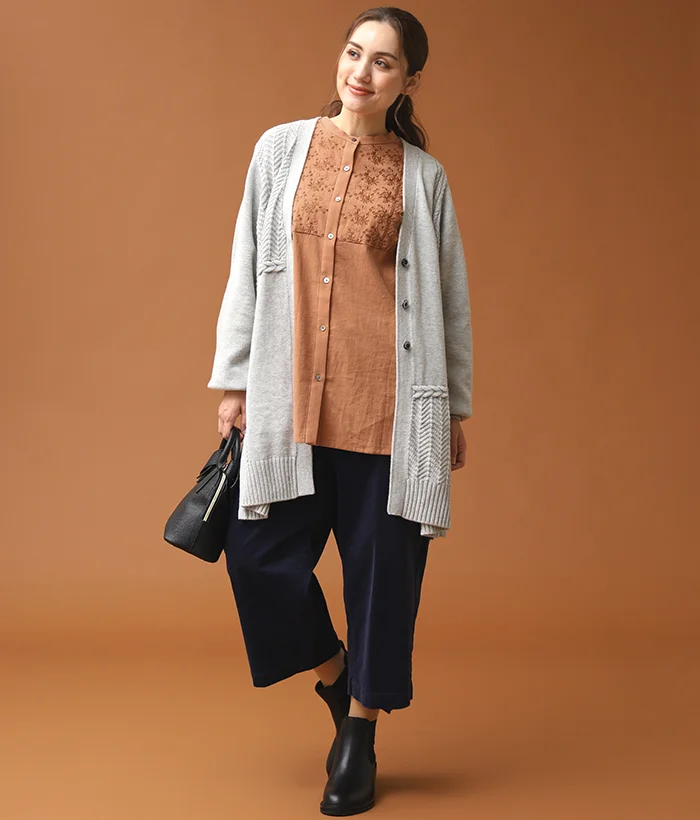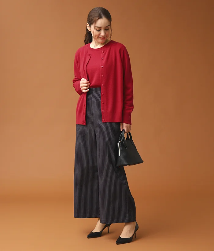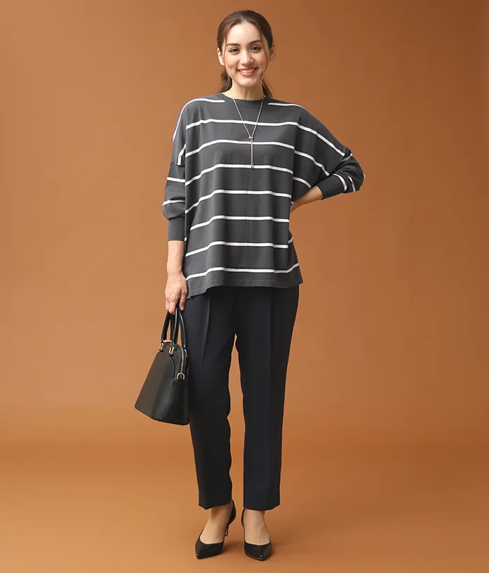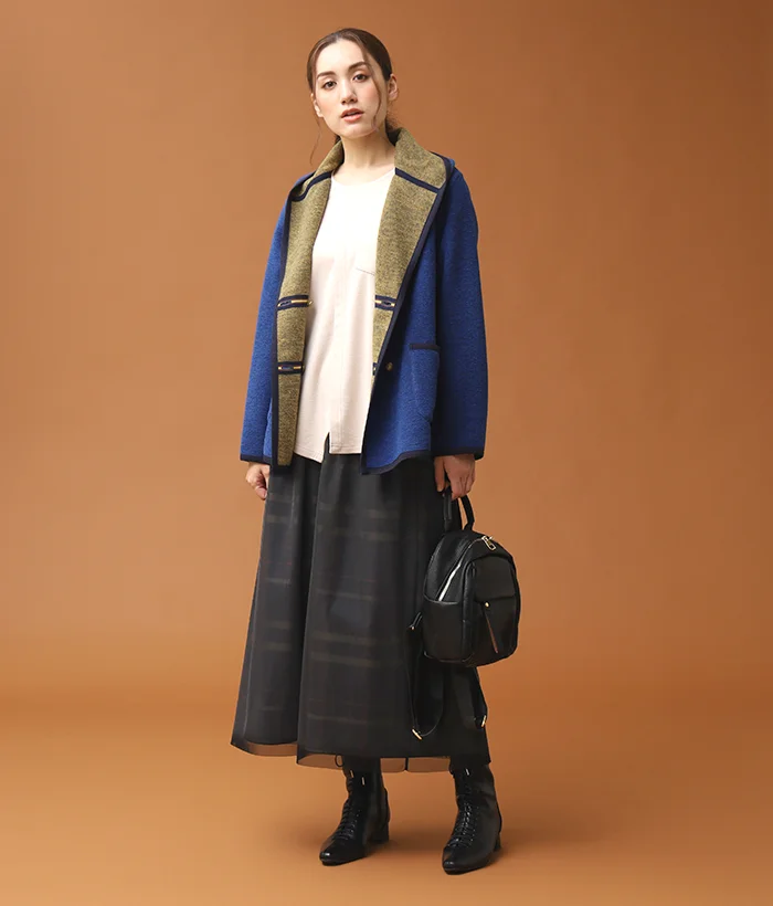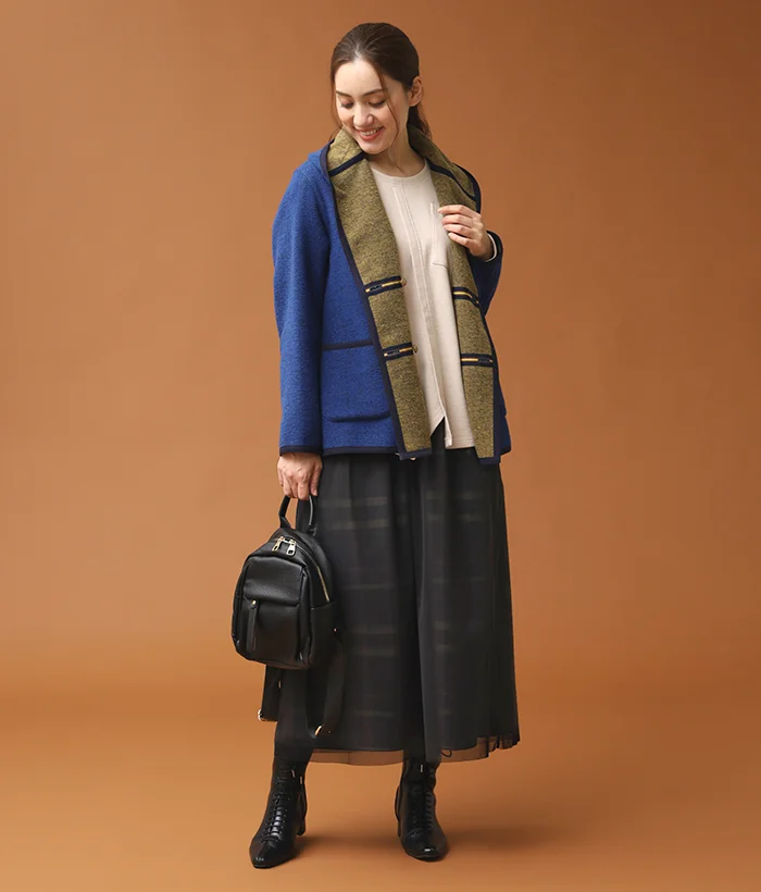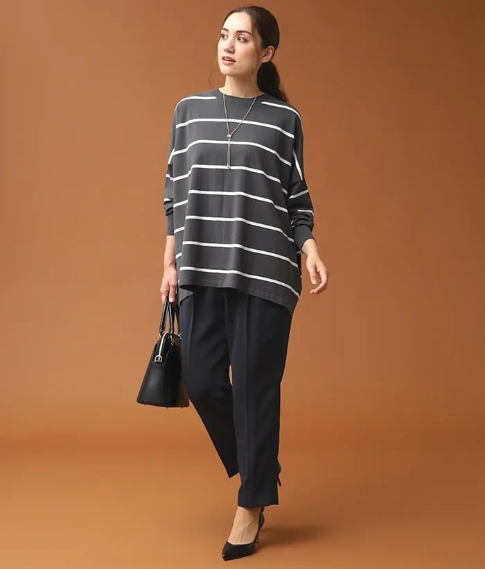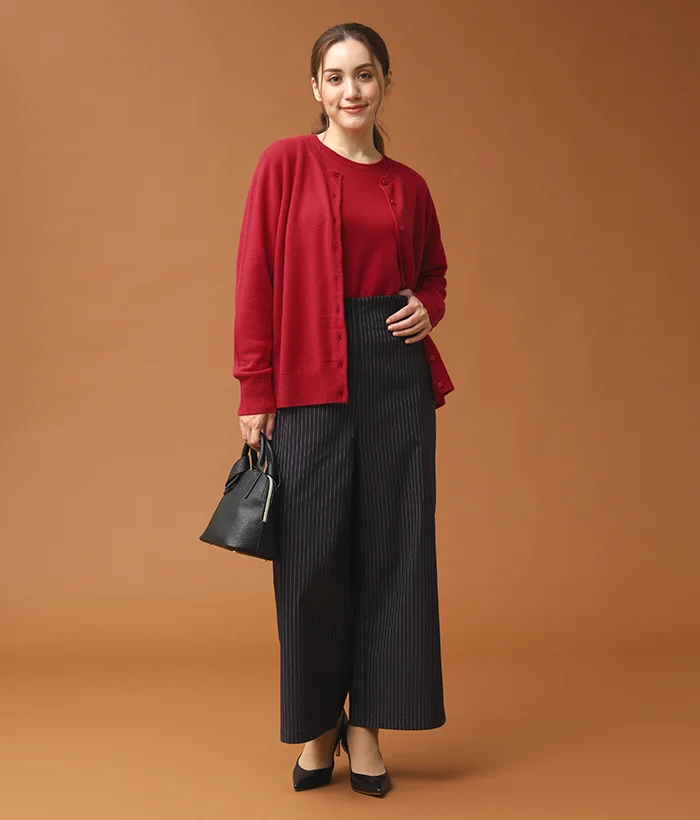 ゆったりとした着心地のよいニットに、ながれるようなシルエットのプリントスカートをレイヤードすることで、カジュアルすぎないきれいめな雰囲気に。煌めくネックレスや淡い色合いのバッグで、スタイリングに優しいアクセントを加えて。