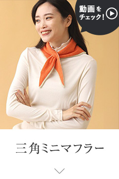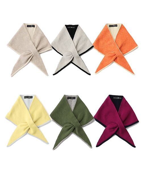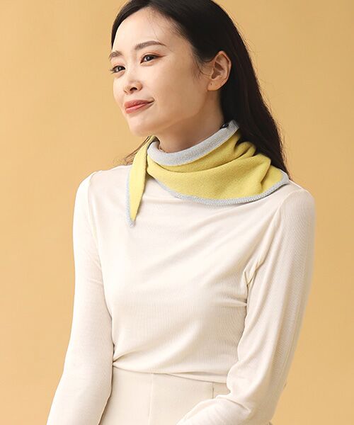 <上質なカシミヤ糸を使用した日本製のタカシマヤオリジナル商品>人気のプチマフラーシリーズ。三角形のリバーシブルタイプで、お好きな向きで襟代わりにも使うことができる、スタイリング自在のマフラーです。イエローベース・ブルーベースそれぞれのおすすめカラーでプレゼントにも最適です。