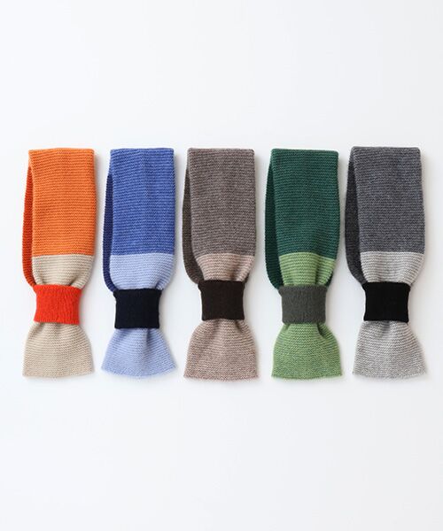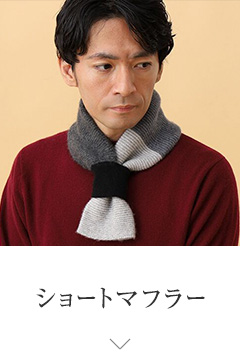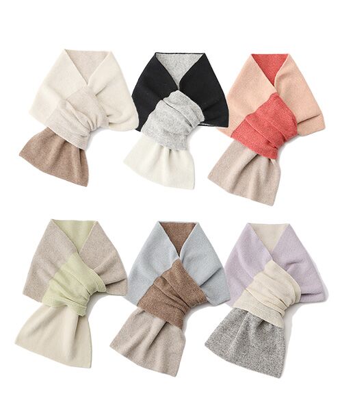カシミヤ100%のミニマフラー。男女兼用のデザインで差し込みタイプなので使い勝手に優れており、トリコロールカラーで普段のコーディネートにアクセントとなる一品。程よい大きさなので、室内の肌寒い時やちょっとした外出にもお使い頂ける便利なアイテムです。