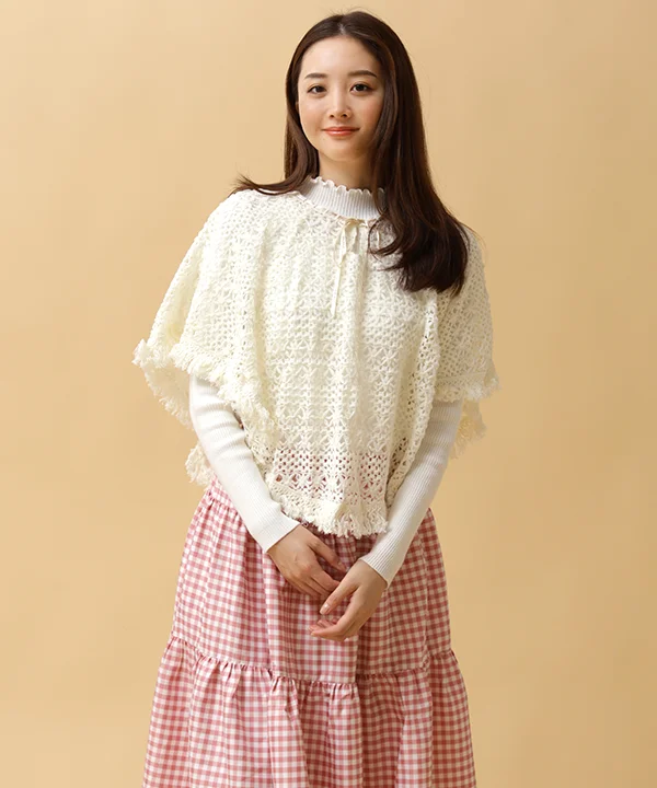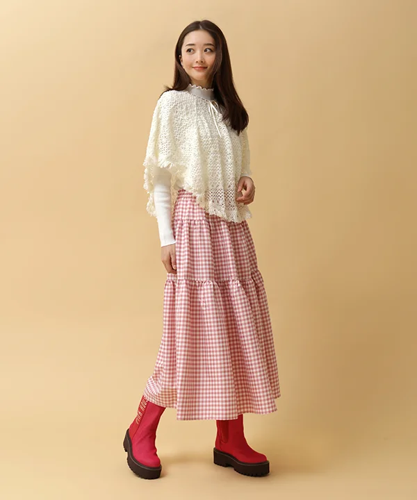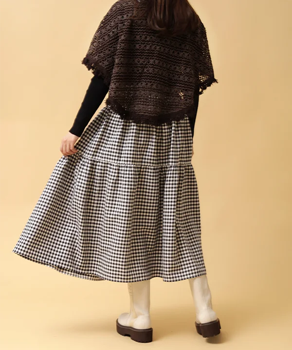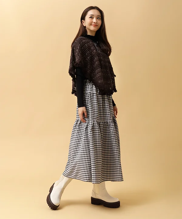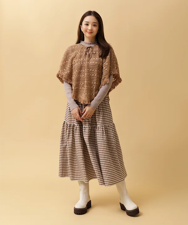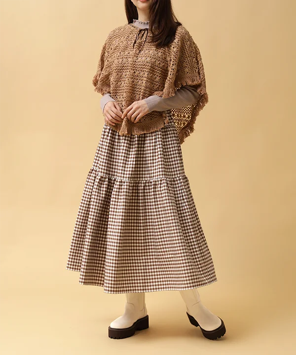 首もとフリルが可愛いリブハイネックに、ギンガムチェックのティアードスカート。 さらに上から編地が可愛いボレロを重ねればキュートなワンコーディネイトが完結。