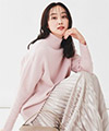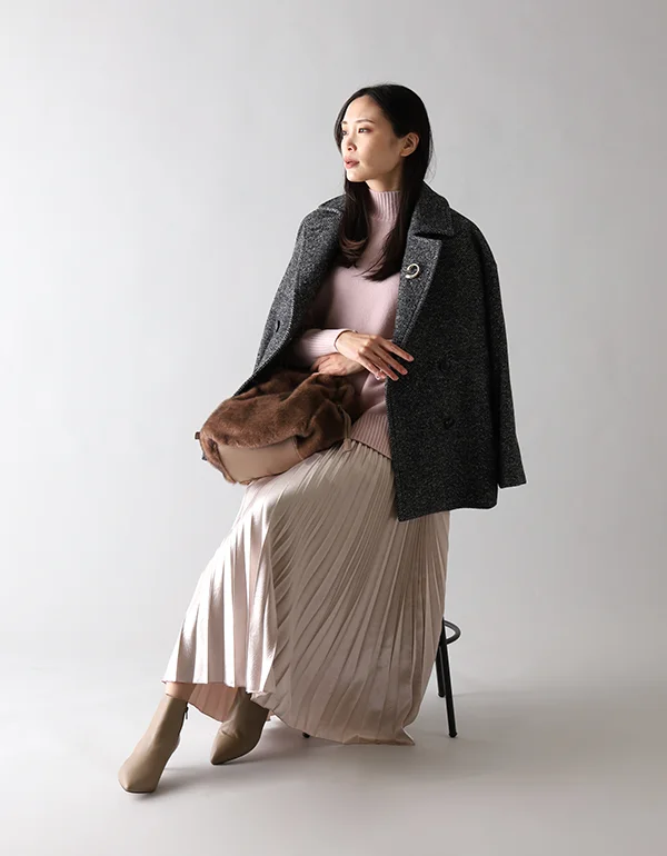 ピンクニットにプリーツスカートの淡いトーンの組み合わせに、ヘリンボン織りのPコートを。