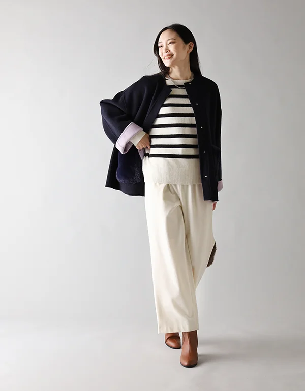 ボーダーニットとドロストパンツでゆるっとリラクシーな組み合わせに、ネイビーのリバーコートをばさっと。