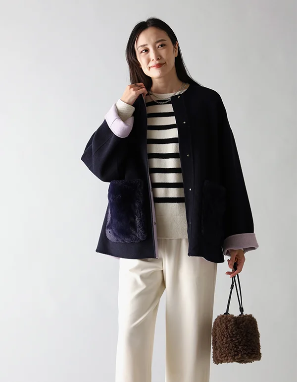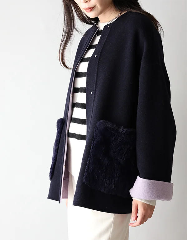 軽やかな着心地や、どんなスタイルにもマッチするミディ丈が魅力。表面の大胆なファーポケットもウールと同色でこなれ見え。