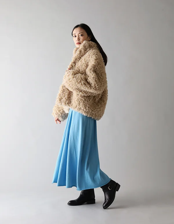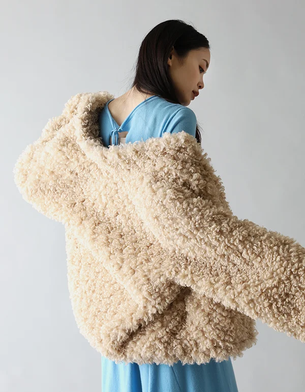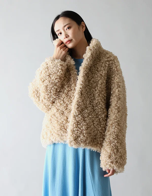 ナチュラルな風合いが魅力のカーリーファー素材はもこもこで暖かいのに軽くて着心地抜群。