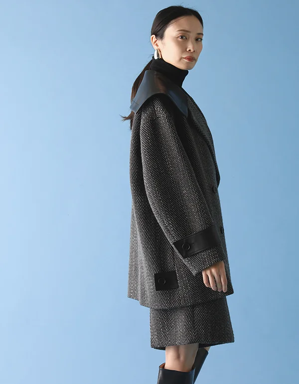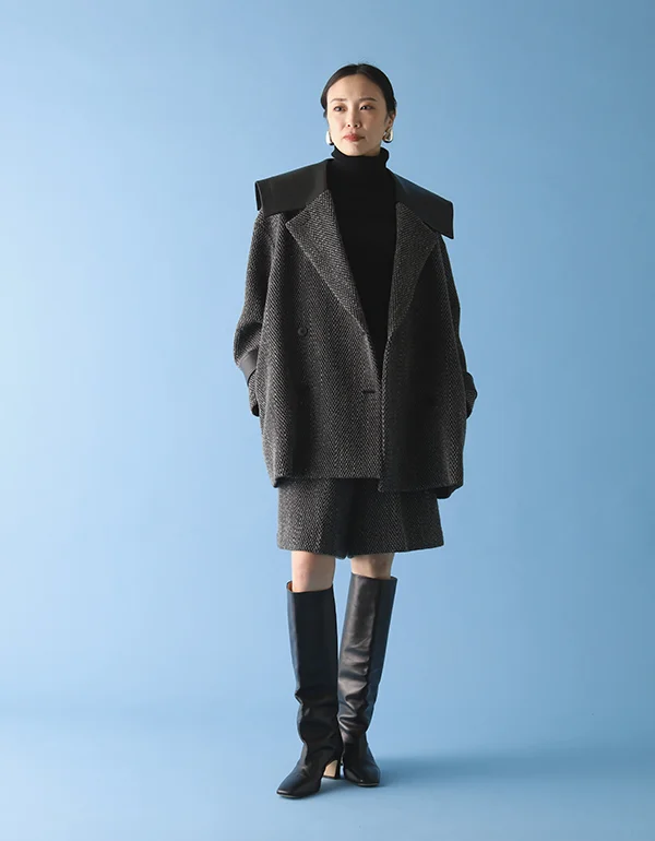 オーバーサイズと大きめの襟のシャープさで、媚びない大人の雰囲気に。