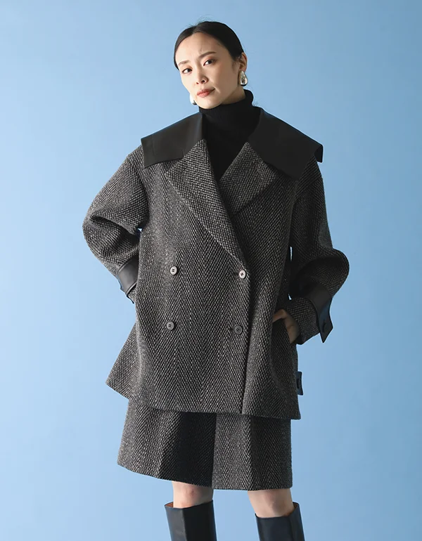 ヒップが隠れる着丈と、上衿とラペルを大きくし、小顔効果も期待できるデザインが嬉しい。
