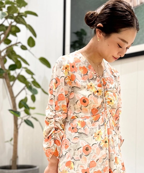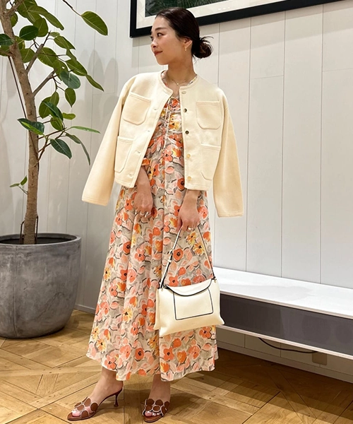 袖口と胸元のギャザーがフェミニンで身体のラインを綺麗に見せてくれる〈Ballsey〉のワンピース。春らしいハッピーな雰囲気が溢れるオレンジ系カラーがおすすめ。あわせた〈Ballsey〉のジャケット風4ポケットカーディガンは、肩肘張らずにきちんと見え、春先に重宝するお役立ちアイテムです