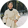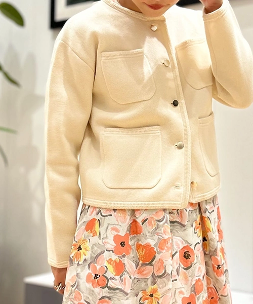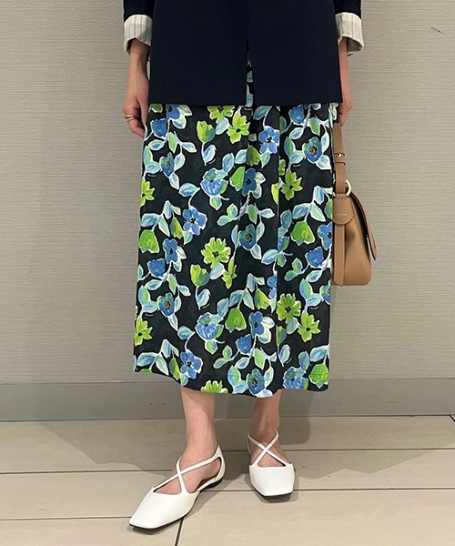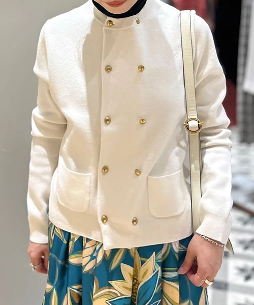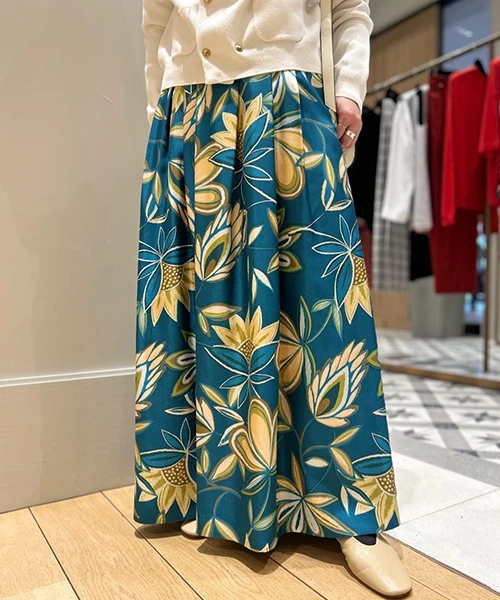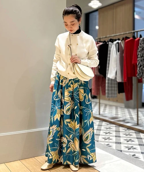 毎シーズンリニューアルしている〈CABaN〉のオリジナルプリントのシルク100%のスカート。今シーズンは手書きのような優しいタッチのプリントと美しいコントラストになっている配色が魅力的。ダブルジャケット風のニットカーディガンは丸みを帯びたクラシカルなゴールドボタンで上品に。