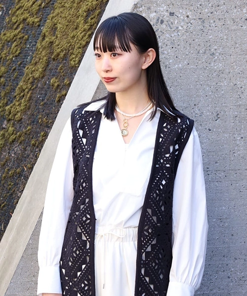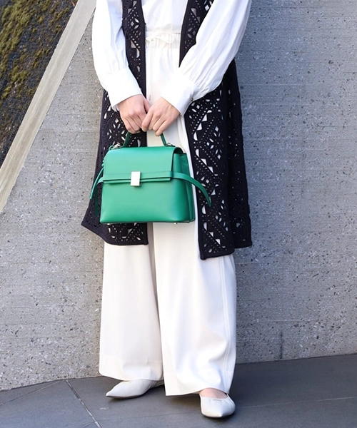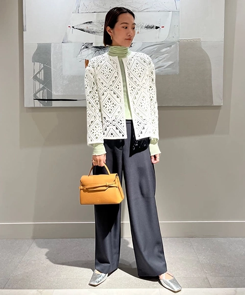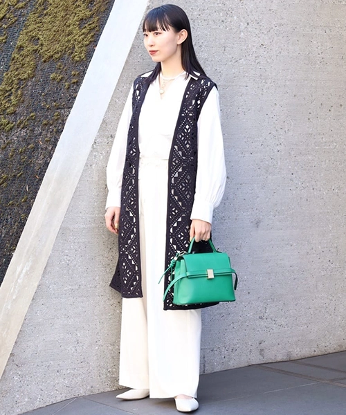 〈Ballsey〉の個性的なモチーフのロングジレは共布で作った付属のベルトでスタイリングに変化をつけられるのも魅力。さらっと羽織るだけで春らしい軽やかなスタイリングが決まるプラスワンアイテムです。白を基調としたスタイルに存在感のあるブラックのロングジレと鮮やかな発色のグリーンが魅力のバッグを合わせました。