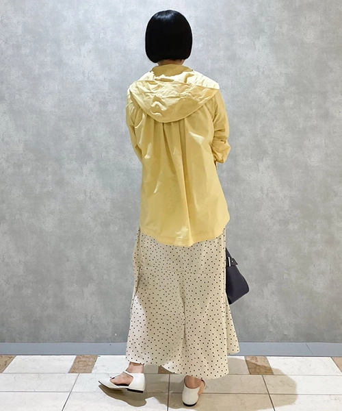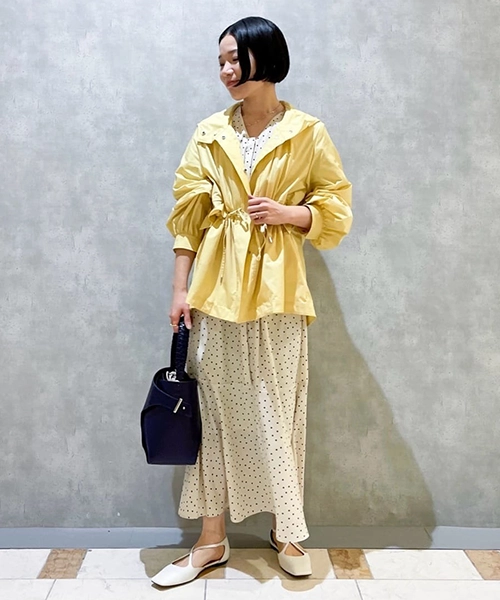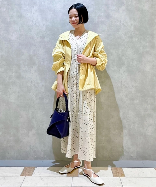 〈Ballsey〉のライトタフタフーデットショートコートはナチュラルな光沢とカジュアルな雰囲気を兼ね備え、シーンを選ばず活躍する羽織感覚のアウター。あわせたワンピースはドットプリントにマーメイドシルエットがフェミニンな印象ですが、深めのVネックラインで甘くなり過ぎず、シワになりくいのでデイリーに使いにもオススメです。