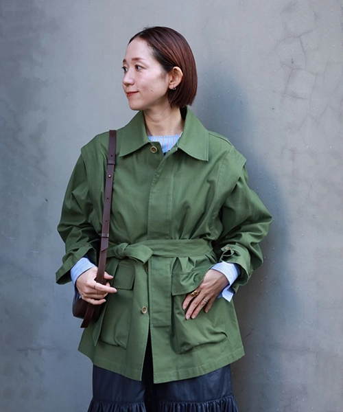 〈MACPHEE〉のミリタリージャケットは付属のベルトできゅっとウエストマークするだけでなく、アームホール内側にファスナーを取り付けているので着こなしや気分に合わせて袖を外してベストとしても着用いただける汎用性のある一着。ロングワンピースを合わせて甘さをプラス。ウエストマークすることでスタイル良く着こなせます。