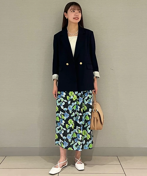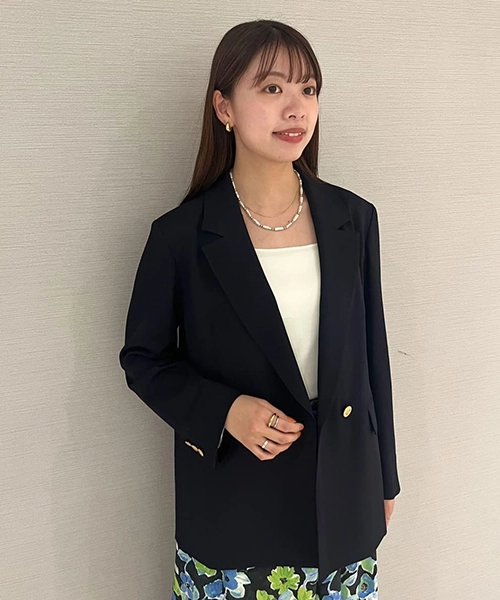 〈MACPHEE〉ウールギャバジン ダブルブレストジャケットは、シーズンレスにお使いいただける上質な定番アイテム。かっちりし過ぎないボクシーなシルエットなので、オンオフとわず活躍してくれるアイテムです。〈Ballsey〉のプリントスカートと合わせ、女性らしいエレガントな表情をプラス。