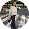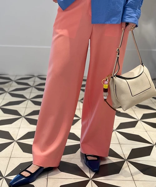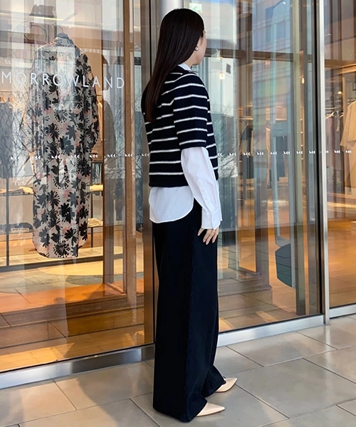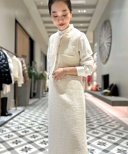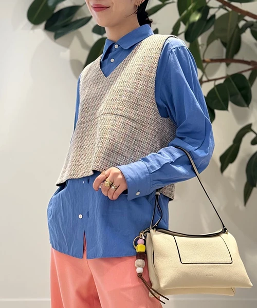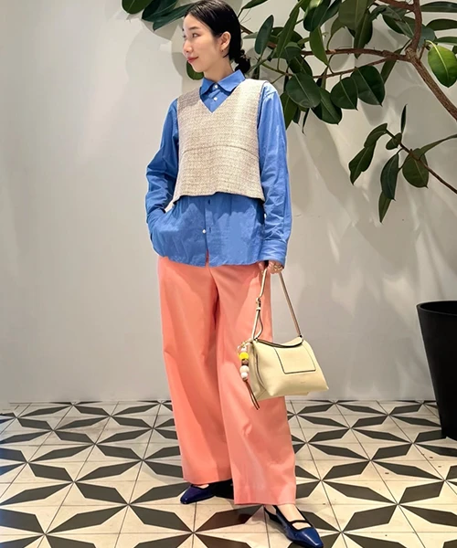 前後2WAYで着用できるフロンタブルの仕様の〈TOMORROWLAND collection〉ツイードジレ。ピンク・イエロー・ブルーなどカラフルな糸を使ったジレの色味にあわせてインナーとパンツをコーディネート。シャツの裾はあえて出してリラックスしたこなれ感を。