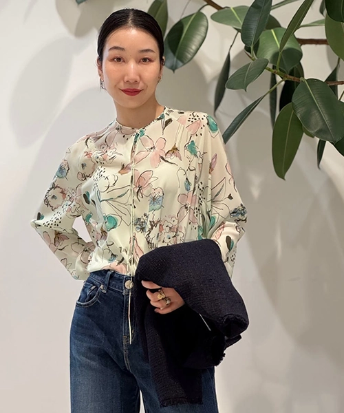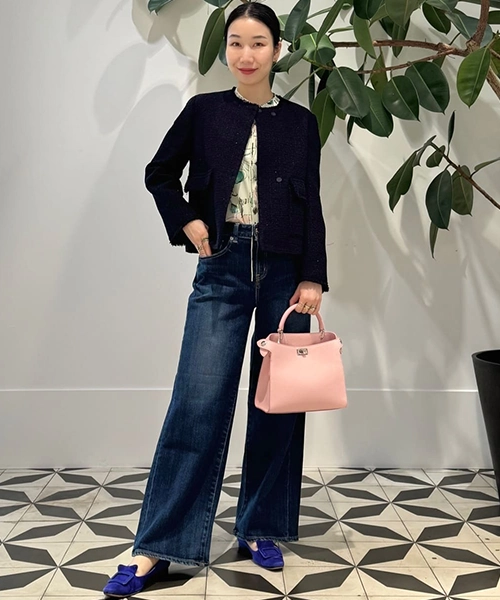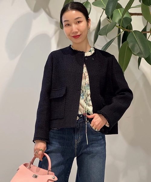 オケージョンやビジネスに使える〈Ballsey〉のラメミックスツイードジャケットをカジュアルに着回し。〈TOMORROWLAND collection〉の手書き風の花柄をプリントしたブラウスと〈RED CARD TOKYO〉の35thAnniversary ワイド デニムパンツを合わせることで、今年らしいバランスで着こなせます。