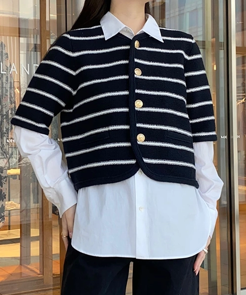 ハーフスリーブデザインの今季らしいシルエットがポイント!〈MACPHEE〉のマリンカラーボーダージャケット。シャツやカットソーにレイヤードすることで、長いシーズン活躍!ニット生地なのでカーディガン感覚で着用でき、短めの着丈なのでハイウエストパンツやロングスカートなどのボリュームボトムスとも相性抜群です。