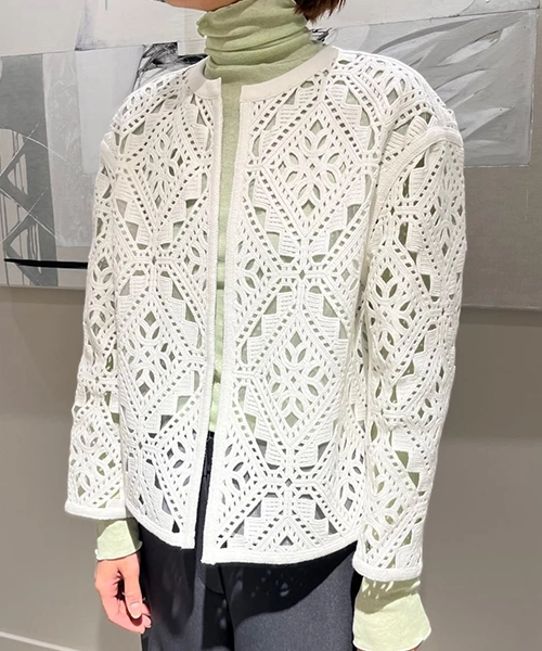 ハンドクロシェのようなダイヤモチーフを刺繍によって表現した〈Ballsey〉定番のエンブロイダリーシリーズのジャケット。ハイネックニットやブラウスはもちろん、シンプルなカットソーやTシャツなど、刺繍の隙間から見えるインナー次第でスタイリングに変化を付けられる一着。カーディガン感覚でさらりと羽織れ、軽やかなスタイリングが決まる存在感抜群のアイテムです。