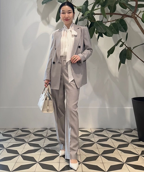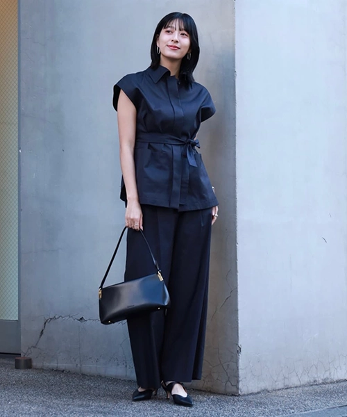 Style.1で着用したジャケットの色違い:ブラックをブラウス&パンツとのセットアップでモードに。同素材のパンツを合わせれば、よりオフィス仕様の正統派パンツスタイルが完成。ブラックジャケットはスタイリング次第で印象が変えられる、一枚はおさえておきたい万能アイテムです。