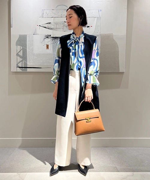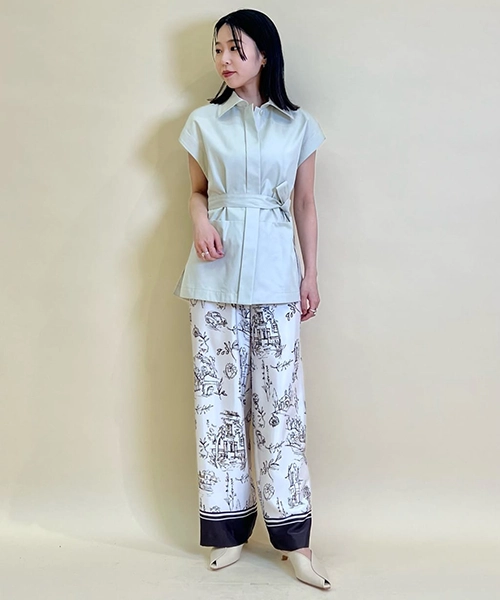 上質なコットンのギャバジン素材を使用したジレはボタンを留めてブラウス感覚で着用も可能。同素材のパンツをあわせ、セットアップスタイルもお楽しみいただけます。
